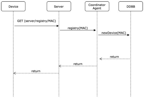 Once the IP address of the server is configured, the device is registered in the system. To do this, the device must make a GET request on one of the endpoints exposed by the API-REST deployed in the system. As shown in Figure 4, the device sends its MAC address, which will be used as an element of univocal identification of the device. After processing the request, the server registers the device in the database and assigns a topic in the server’s MQTT broker. This topic will be the communication channel through which the messages will be exchanged between the server and the device and will be governed by the representative agent of the MAS designed.