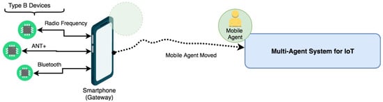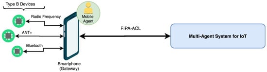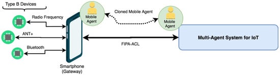 Type B devices, as already mentioned, are those that do not have a direct communication channel with the Internet through which to transmit the measured data. These devices are very numerous in current IoT environments, from heart rate monitors, cadence sensors, and temperature sensors to RFID identification cards. For the system proposed in this work, a mobile agent is implemented in an Android Smartphone device that will act as a gateway between these devices and the distributed multi-agent system.