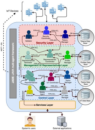Regarding the IoT multi-agent organization designed in this work, it is worth noting that it is a semi-closed organization able to include new external agents in a controlled manner, guaranteeing stability, trust, flexibility, and openness. For this, the MAS system is organized into four different layers. The first is a security layer where all the messages that arrive from the outside of the system will be filtered, avoiding the malicious injection of messages or the communication with previously unregistered agents. A second layer will be in charge of the management of new representative agents that act on behalf of the wireless devices. The third layer contains all the agents responsible for IoT data management and the coordination of the architecture. The service layer is open and may contain mechanisms and techniques for processing and analyzing different data, depending on the environment in which the system is deployed.