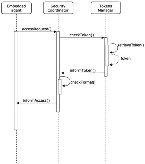 When it comes to providing a greater degree of confidence and avoiding anomalous behavior in embedded agents, the figure of the representative agent has been implemented. As mentioned in the previous section, thanks to the implementation of the representative agent mechanism, all the new instances that correspond to a new embedded agent will be created from within the organization. Being created from within, the system ensures that the behavior of the agent is clearly defined and strictly limited to the functions assigned by default. Below are some of the sequence schemes involved in the security and trust of the system. Figure 11 shows the relationship between the embedded agent and the security coordinator when processing an external access request with a previous token. In this relation, the token manager checks the validity of the sent token.