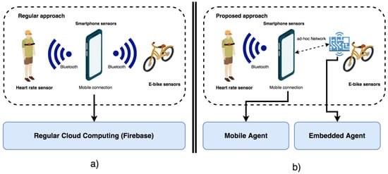 Figure 15b shows the deployed sensor system that will act as the IoT layer of the proposed architecture in the case study. The user’s Smartphone plays a double role: on the one hand, it makes use of different sensors that have the vast majority of devices, such as the GPS sensor, compass, or accelerometer; on the other hand, it provides a mobile data network to the ESP8266. Connected to this device and through a Bluetooth connection are the rest of the elements of the system. One of them is the electric bicycle, which provides basic information, such as speed, energy consumption, or battery charge. On the other hand, it is possible to connect different external sensors, such as the heart rate monitor responsible for measuring the heart rate of the user during the performance of an electric bike tour. Figure 15a shows a classic approach to the problem through the use of cloud computing services such as Firebase. This regular approach aims to compare the efficiency of the architecture proposed in this work.