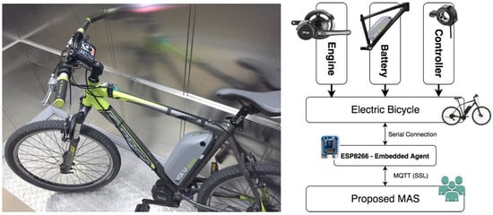 Specifically, in this case study, an electric bicycle of the Orbea brand has been used, to which an IoT node has been added through an ESP8266, as can be seen in Figure 16. In this way, all the data that are measured by the system are managed by the IoT node on which the embedded agent is deployed that will act as an external agent in the MAS designed architecture.