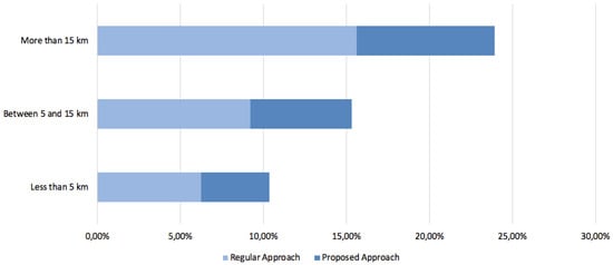 As previously mentioned, the case study carried out in this work compares a classical approach based on a sensorization and cloud processing system with a new approach based on embedded intelligent agents. To carry out this comparison, the data collection platform for electric bicycles ebikemotion developed in collaboration with the research group of the University of Salamanca has been used. This platform has more than 5000 active users around the world who send data on their electric bike routes daily. Thanks to the data collected through the traditional approach, it is possible to compare the data of the routes obtained by the users who have tried the system proposed in this work. First, it is possible to compare the results on battery consumption by the system. Thanks to the continuous sending of the battery charge, it is possible to measure the efficiency of the system. The data have been categorized based on the distance traveled by the users on each route, obtaining three groups of routes: Routes of less than 5 km, routes between 5 and 15 km, and routes of more than 15 km. As shown in Figure 17, the battery consumption (battery of the electric bicycle plus Smartphone battery) is always lower in the routes where the proposed system has been used. This reduction in battery consumption is mainly due to the fact that the information in the regular system is processed in its entirety in the mobile device, and as a continuous communication of input/output of data within the cloud environment; while in the proposed system, the computing of the data is distributed in the different IoT devices deployed. Likewise, communication with the agent architecture involves more agile and lighter communication in the sending of data than that produced with regular cloud environments.