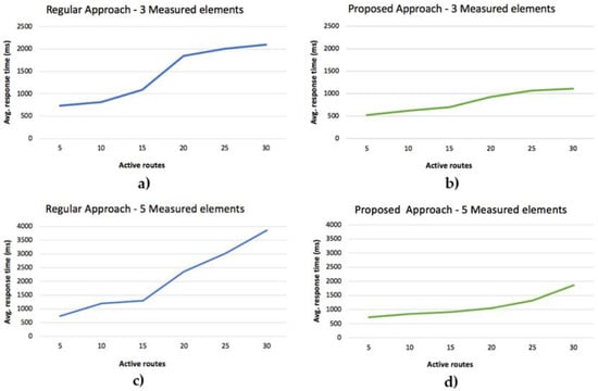 The routes that only have three measurement values (speed, assistance level, and battery) have been compared to those with five variables (speed, attendance level, battery, heart rate, and cadence). After analyzing the average response time of both proposals, it can be observed that the proposed system provides a significant improvement in the response times. It is also possible to observe how the increase of users (active routes) does not greatly affect the execution times, which remain practically constant, unlike the classic approach.