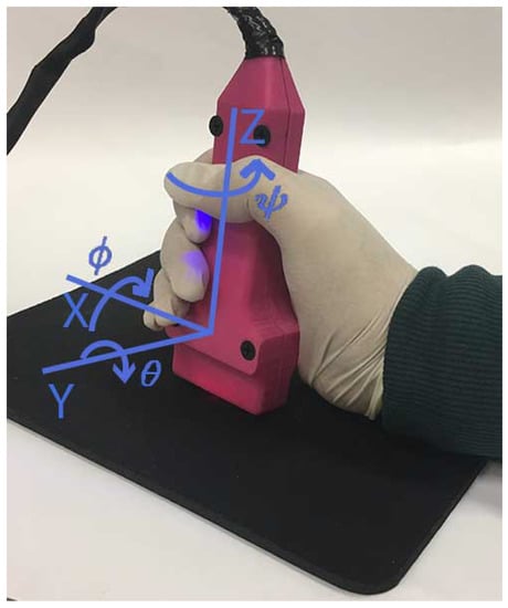 The sensor module consists of a commercial inertial measurement unit (IMU) MPU-9150 from InvenSense (InvenSense Co. San Jose, CA, USA) with mutually orthogonal tri-axial accelerometer, gyroscope and magnetometer, which is used to estimate the 3D orientation (roll, pitch and yaw angles) of the probe (Figure 2). In addition, the hardware components from an optical mouse are included to detect the two-dimensional translation movement of the probe back and forth, left and right, relative to the underlying surface. In this way, we will capture the typical rotation and translation movements that a rehabilitation specialist performs when positioning an US probe.