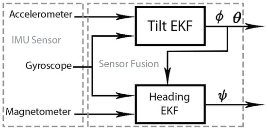 To fuse the information of the three IMU sensors, we will use a dual-extended Kalman filter (Figure 3). The first filter, called Tilt EKF, will compute pitch () and roll () taking as input the gyro data at the prediction stage and it will use the accelerometer data at the correction phase. The second filter, named Heading EKF, will compute yaw angle () by integrating over the time the gyro information and the Tilt Filter output () at the prediction stage and it will use the magnetometer data at the correction phase. In this way, our method decouples the estimation of the pitch and roll angles from the magnetic disturbance, using the two-step orientation estimation.