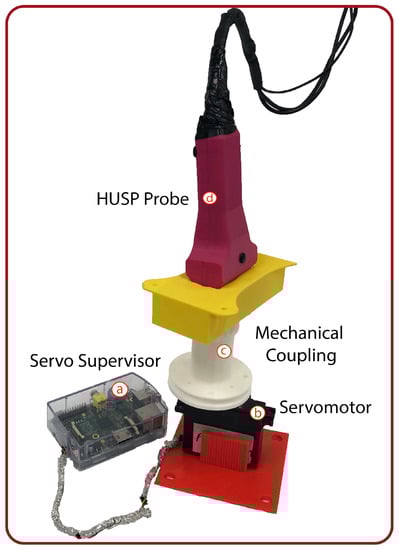 This section focuses on the experimental validation of the proposed algorithm to calculate the complete probe orientation by the sensor fusion of data provided by IMU. In order to perform the tests, we have built an experimental platform (Figure 4) that allows the probe to rotate, in a controlled way, with different orientations. The designed HUSP (d) was placed on a support piece (c) that is coupled to a servomotor (b). The support is made of plastic and has been designed for the servomotor and the probe was separated at a certain distance (about 25 cm) in order to ensure that the electromagnetic field generated by the motor operation does not interfere with the measure of the earth magnetic field. A Rasberry Pi (a) serves as motor supervisor, so the HUSP rotates solidarity. With this experimental development, we can control the rotation angle of the probe and the time it takes to get its final orientation at the set speed. A script for the servomotor to rotate a certain angle at a certain speed and stop a certain time was programmed in the Rasberry Pi. It was verified that the values fixed in the script were met correctly by the servomotor, as it is obvious.
