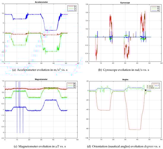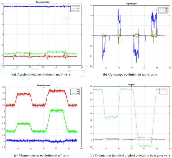 In this second test, later, only variations in the pitch angle have been made: and turns with rad/s. In Figure 7, the IMU measurements (Figure 7a for accelerometer, Figure 7b for gyro, Figure 7c for magnetometer) and calculated orientations (Figure 7d) are shown.