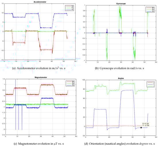 In the second test, the probe was arranged horizontally, by means of other support pieces, in order to check the roll angle and the pitch angle. First, the x-axis of the body frame was made to coincide with the axis of rotation of the servomotor (roll angle variations only) and, later, the y-axis (pitch angle variations only). In this second test, first, the probe rotates from to with rad/s; then, it stops and it returns back to initial orientation; afterwards, it turns to , it stops and goes back to initial orientation. In Figure 6, time evolution of accelerometer measurements (Figure 6a in m/s vs. s), gyro (Figure 6b in rad/s vs. s) and magnetometer (Figure 6c in T vs. s) can be observed, with an important presence of white noise. In Figure 6d, the orientation calculation with EKF is displayed, where varies from to , then from to , stopping for 10 s at each change of orientation.