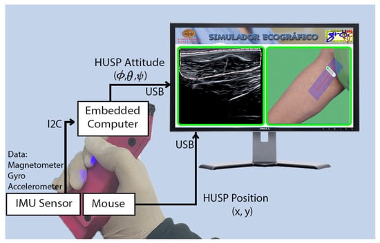 The HUSP device has been integrated into the complete platform to instruct future rehabilitation specialists in MSK ultrasound imaging. In Figure 8, one can see a scheme of our US training tool. The computer embedded in the probe replica, with the IMU data, calculates the probe attitude and sends it to the desktop computer through UART-USB communication. The probe replica incorporates the board of an optical mouse, connected by USB to the desktop computer, to obtain the relative position of the probe replica in the model.