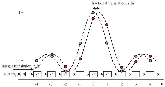 As shown in Figure 2, in discrete-time, the total delay at time n is implemented by an integer and a fractional part, such that . The integer part indicates the number of taps by which the input signal will be delayed, and the filter coefficients take into account the fractional part at a given time instant n. The position of this delay can then be updated for each time instant in order to implement the desired time-varying resampling.