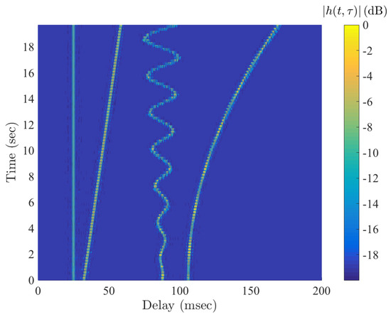 It is also useful to represent the channel frequency spectrum, particularly for multicarrier transmission. In [7], the channel frequency response at time instant t is obtained by taking the Fourier transform of Equation (6) with respect to such that its frequency response as a function of time t and frequency f is