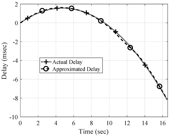 Once the time-varying time-scaling factor over the packet is approximated by interpolation, the passband received signal can be resampled in a time-varying manner using the TVFDL. An example of the approximation of the time-varying delay is shown in Figure 7. In this channel simulation, the relative velocity between the receiver and transmitter is increasing continuously from −1 to 2.5 . The negative speed shows a positive delay and the positive speed creates a negative delay. The delay varies with time following a quadratic function because the acceleration rate remains constant for the packet duration.