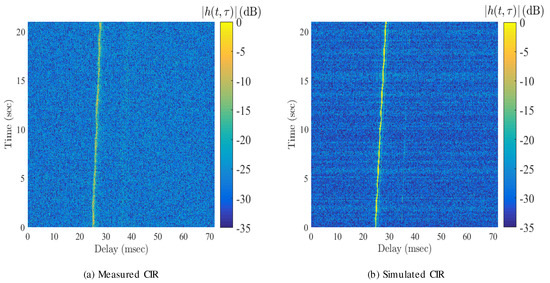 A standard cross-correlation channel sounder was implemented to extrapolate the channel impulse response as a function of time. Figure 8a shows the channel impulse response of the measured channel, while Figure 8b is the output of a shallow water channel simulator that was run for the defined deployment geometries. As can be observed, there is a strong first path arrival, and a second path can be faintly recognized at an additional delay of 5 ms. Since this deployment is in the ultra-sonic regime, it is expected that path delays that propagate over additional distance will suffer from much greater attenuation due to additional losses at high frequency, thus the main tap arrival is much stronger than for the later path arrivals. The channel amplitude remains relatively constant, and the main path delay increases from 26 to 30 ms within a 21 s time-span. The increasing path delay was corrected using the Doppler compensation algorithm described in Section 3. Note that, as can be seen, there is a good degree of resemblance between the measured and predicted model.