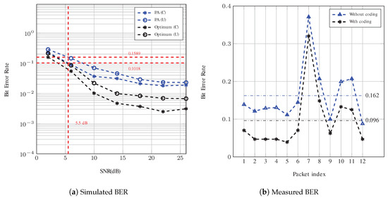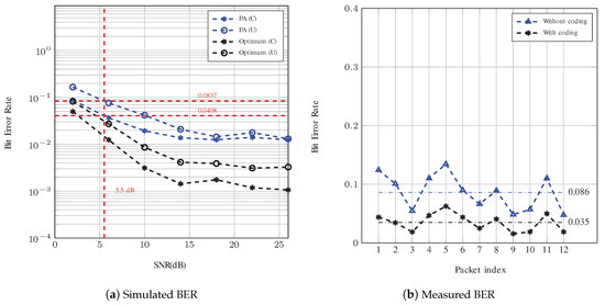 The BER of both systems was evaluated through measurements and the results are presented in Figure 9b and Figure 10b. For Config. #1, the bit rate is 560 bps and 1680 bps with and without coding, respectively. According to Figure 9a, the corresponding BERs for this configuration using PA compensation at SNR = 5.5 dB are simulated to be 0.102 and 0.159. These values are very close to the average measured BERs, which are 0.096 and 0.162, respectively, for a system with and without repetition coding. Note that the 95% confidence interval for the measured BERs of the coded and uncoded system are in the ranges of and , respectively.