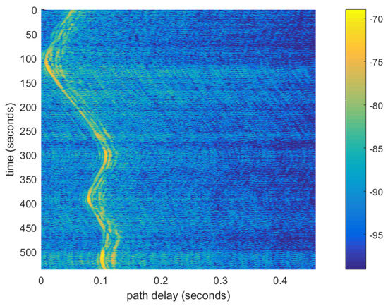 The link channel impulse response is shown in Figure 11 measured using a set of concatenated pseudo-random sequences. As can be seen, over the 9-min period, there was significant Doppler scaling that induced a variable delay of arrival between the OFDM symbols.
