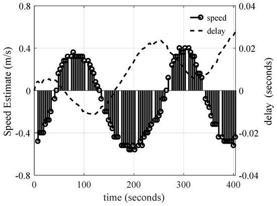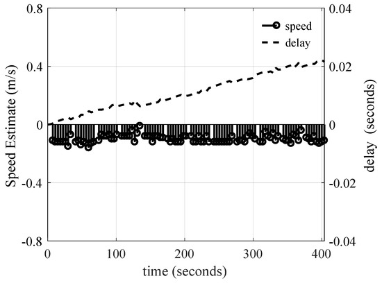 Next, the time-scaling was estimated when the boat was moving in a circular motion. When this test was run, the distance between the transmitter and receiver was 4 km. As shown in Figure 13, the maximum absolute speed of 0.5 m/s (1 knot) was estimated, consistent with the physical boat speed that the captain monitored. Note that the speed estimation curve follows a sinusoidal-like shape since for some duration the transmitter was driving towards the receiver, and otherwise it was going away. The correction delay used to compensate for the boat mobility is also shown in Figure 13. As can be observed, when the boat was moving at a negative velocity, the compensation delay increased, otherwise it decreased.