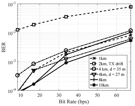 Measured bit error rate without Doppler compensation as a function of data rate for different ranges.