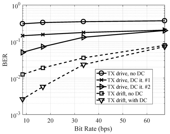 Next, the bit error rate of the OFDM symbol with Doppler compensation is shown in Figure 15 as a function of useful bit rate for the mobile conditions. As can be observed, the OFDM performance was very poor without compensation, particularly for the test in which the transmitter vessel engines were turned on. In this scenario, after one Doppler compensation iteration, the performance was only improved marginally. This is attributed to interpolation errors when the time-scaling factor varies significantly during an OFDM symbol. Consequently, two Doppler estimation and compensation iterations were run to improve the performance. After two iterations, improvements were no longer observed, and, for a bit rate of 8 bps, the BER was improved to 0.05 after two iterations for the scenario in which the vessel’s engines were turned on. Although the performance was improved, this highlights the difficulty of establishing a reliable link using OFDM in mobile conditions. When the boat was drifting, the original Doppler shift was more benign, and the output BER was 0.003 for a bit rate of 8 bps. More efficient coding techniques can be applied to further improve the performance in mobile conditions.
