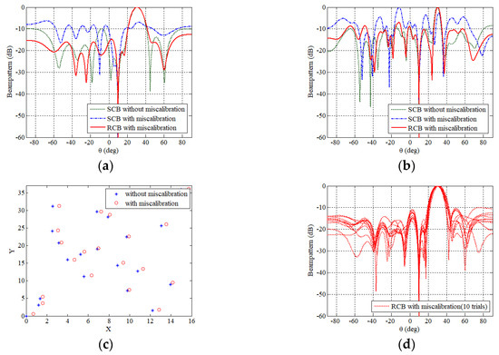 Comparison of the beampatterns in the (a) and (b) plane of the SCB without mis-calibration, the SCB and the RCB with mis-calibration. (c) The elements’ locations with and without mis-calibration. (d) The beampatterns of RCB with mis-calibration through 10 trials.