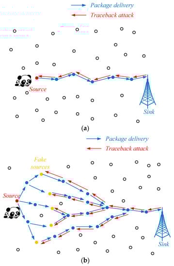 The trace-back attack in different networks. (a) Networks without source-location privacy protection; (b) networks with source-location privacy protection.