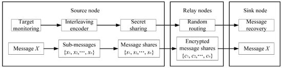 Initially, the source node generates message and then we map to a set of message segments through interleaving encoder. In this paper, we attempt to design a -secret sharing scheme and hence the original message needs to be split to exactly sub-messages with equal lengths. For convenience sake, we assume that is denoted as a binary number and the size, , where is defined as the number of bits. If the size of cannot be divided by , we fill by a set of specific symbols at the tail until it can be divided into equal-length sub-messages. Then, we split to a set of sub-messages through an interleaving encoder. As an example, in Figure 4, we split to four sub-messages, , and each sub-message contains a part of message . Moreover, each sub-message is composed of four message fragments which are discontinuously extracted from . In this way, each sub-message is of no clear semantic information. In other words, even if the plaintext of a sub-message is captured by the adversaries, they cannot get valuable information about message . However, the sink node can recover by an interleaving decoder once it can get .