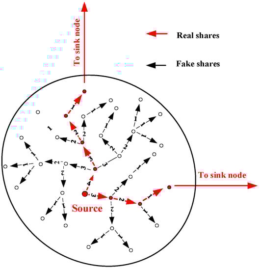 In theory, the adversary needs to first find the relay node, the fake source node and, finally, the real source node. As shown in Figure 6, the shares of message are transmitted to the sink node from different directions. Therefore, it is almost impossible for the local adversary to locate the relay nodes, let alone the fake source node and the real source node. For different real source nodes and messages, the fake source nodes, relay nodes are totally different. The adversary cannot receive continuous package flows and hence the adversary can hardly trace back to the cloud. However, the adversary may occasionally locate the cloud sometime and, in this case, he still cannot find the real source node, because all the nodes in the cloud are indistinguishable.