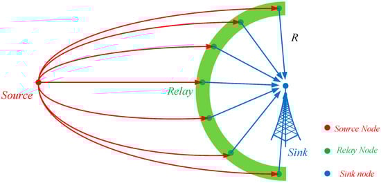 At the border of the cloud, the fake source nodes send the shares to the sink node independently. To hinder the adversary locating the cloud easily, we integrate the All-direction Random Routing algorithm (ARR) [] into our scheme. In the ARR scheme, the relay node is defined as the nearest node to the virtual location that is randomly selected by the source node. To balance the security and energy-efficiency of our scheme, the fake source node employs only one relay node and the possible area of the virtual location is presented in Figure 6. Initially, the real source node randomly selects a parameter for message and adds the parameter to all the shares of . Then, the fake source node selects the virtual location based on parameter . Specifically, the virtual location can be any point on the half circle with the source node as the center and as the radius.
