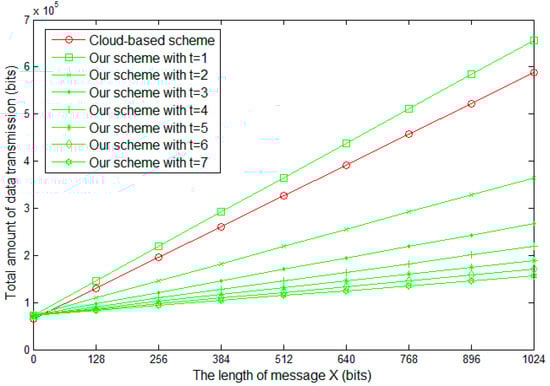 By combining the above two phases, the total data transmission amount is in the existing cloud-based scheme. In our scheme, the total data transmission amount is . For convenience sake, we set and the simulation results are presented in Figure 7.