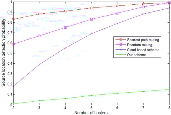 We employed the probability that the adversary can locate the source node in the simulation period to estimate our scheme. The probability was calculated by the number of times that the adversary can locate the source node to the total time of runs. As shown in Figure 8, with the increasing of the hunters’ number, the source-location detection probability increases for all the four schemes. The shortest path routing algorithm cannot protect the source location properly. Phantom routing algorithm performs better because of the random walk phase. However, the adversary can easily locate the source node by employing several hunters together. Though the cloud-based scheme can defend against the adversary if the number of hunters is small, it cannot defend the smart adversary model if the number of hunters is large. Our scheme performs the best because it is extremely hard for the adversary to find the cloud let alone the source node.