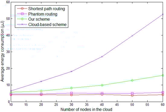 In Section 6.1, we theoretically analyzed the data transmission amount of our scheme. Though most energy of the network was consumed in delivering the data, some extra energy was consumed in processing these data. The total energy consumption of the network is presented in Figure 9. It can be observed that the average energy consumption of our scheme is slightly larger than that of the shortest path routing algorithm and phantom algorithm, and it is much more energy-efficient compared with the cloud-based scheme.