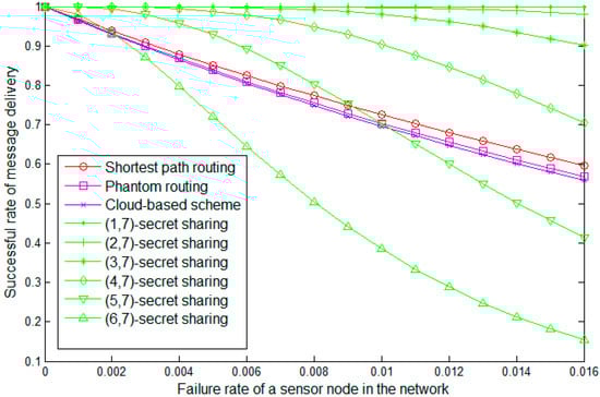It can be observed that with the expending of the network’s size, the success rates of all the schemes decrease. In a larger network, the packages need to be relayed by more steps and hence the rate of package drop increases. The shortest path routing algorithm has the best performance because the packages can be delivered to the sink node with the least hops. The phantom routing algorithm also has a similar performance. Considering some extra walk steps in the random walk phase, the successful rate of the phantom routing algorithm is lower than that of the shortest routing algorithm. The cloud-based scheme has the worst performance. This can be explained by the fact that the packages walk in the cloud for a long distance and hence the hops greatly increase. Though the packages in our scheme also walk in the cloud, the secret sharing scheme improves the performance of our scheme. The sink node can recover the original message based on a set of shares rather than all the shares and this improves the tolerance of node failure.