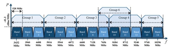 The physical layer of ultra wideband using MB-OFDM is described by ECMA-368 in Wireless personal area (WPAN) and is also advised for vehicular networks. It is allocated into the unlicensed 3.1–10.6 GHz frequency band. It also adopts 53,3 Mb/s, 80 Mb/s, 106,7 Mb/s, 160 Mb/s, 200 Mb/s, 320 Mb/s, 400 Mb/s, and 480 Mb/s as data rates. In Figure 1, the ECMA-368 band is shown; this band is split into six groups of bands. Band groups 1 to 4 contain three bands each, covering the bands 1 to 12. Band group 5 consists two bands 13 and 14. Band group 6 contains the bands 9, 10 and 11. Band group 1 is used for mandatory mode and the rest of the bands groups are dedicated for future use. The center frequency is related to the band number by: (MHz) []. The transmitted MB-OFDM symbols are time-interleaved across the 14 bands according to the specified time-frequency code (TFC) [].