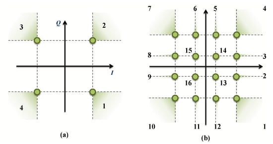 As it is described in [], the ACE-AGP is an iterative algorithm. In the following, the algorithm will be summarized. Every constellation point is moved within the allowable region away from its initial position in an iterative procedure. As example, for QPSK and 16-QAM cases, in Figure 3, the allowable regions are depicted (shadowed). We first clip the signal peaks in the time-domain signal and observe what happens in the frequency-domain. If points moved into an allowable region, the algorithm keeps them, if not, they are restored to their previous positions and the time-domain signal is evaluated again. Mathematically, it can be summarized as follows: