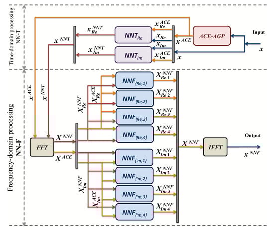 For less complexity and fast convergence, authors in [] proposed a novel NN architecture designed and trained to obtain low PAPR signals by synthesizing the behavior of the ACE-AGP algorithm, but with much less complexity. The idea is to design an NN that would be able to obtain similar signals than ACE-AGP but with less complexity and without the iterative process that takes time and resources. To do this, as explained in [], the NN is trained with time-domain and frequency-domain signals obtained from ACE-AGP as references. Thus, once the NN is trained, it is able to generate similar signals (with low PAPR) directly from the original ones without the iterative process and with less complexity. Thus, authors in [] developed NN models based on the time-domain and frequency-domain OFDM signal, respectively, and provide the theoretical framework. Here, a brief description is provided for clarity purposes.