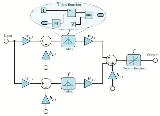 - A hidden layer: contains two neurons adopting triangular function activation.