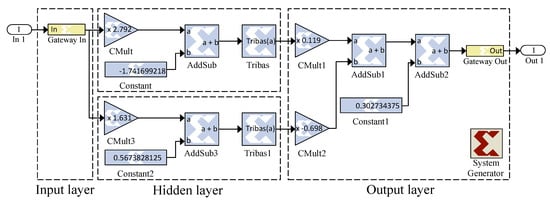 The training process of time and frequency-domain NN is done in an offline way; therefore, only their layers will be implemented on an FPGA circuit (without the learning algorithm). Figure 8 and Figure 9 illustrate the architecture of a NN as well as the activation function implemented during our development, respectively.
