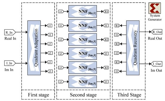 The implemented architecture in the case of 16-QAM is subdivided into three different stages as shown in Figure 10. The first stage allows for determining the belonging of a point to a quadrant of the constellation and adapting it to frequency-domain NN. The second stage consists of three blocks, each one grouping two NNs allowing a different treatment of the real and imaginary parts to ensure a proper expansion. The last stage allows for recovering the original position of the constellation point. In case of QPSK modulation, the same stages will be used, with the difference that the second one will contain one block instead of three.