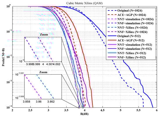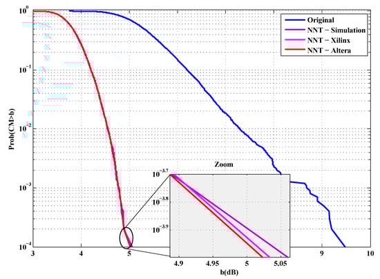 From these figures, it is clear that the results provided by implementing the proposed solutions are faithful to those obtained by simulation. Indeed, in the case of an implementation on Xilinx FPGA chip, the average error in reduction of the cubic metric is 0.002 dB, while, for an implementation on the Altera FPGA chip, it is equal to 0.003 dB. The small errors observed can be justified by the truncation errors caused by the fixed-point representation.