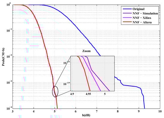 Concerning the cubic metric, a slight error of 0.002 dB is observed in the case of Xilinx and 0.003 dB in the case of Altera with respect to simulations. This is justified by the residual error of the fixed-point calculation adopted by each of these constructors.