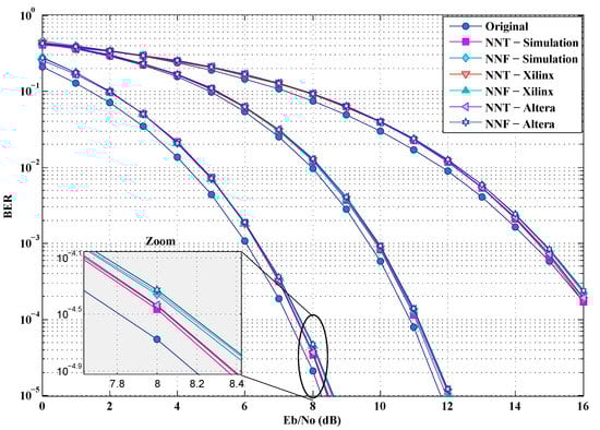 To analyze the BER by simulation, we use the UWB channel model and Additive white Gaussian noise (AWGN) is added at the Rx. These simulations adopt three different data rates 53.3, 200 and 480 Mbps, and the Time Frequency Codes TFC1 of the band group number 1 []. This will allow us to test the proposed solutions according to the modulations imposed by the standard (QPSK and DCM) taking into account the full range of possible rates. It should be noted that, besides the real implementation on FPGA (Xillinx or Altera), some simulations have also been carried out in order to check and validate the implementations. Figure 18 and Figure 19 show, in comparison with the simulations, that the hardware implementations have very little impact on the BER. In fact, this slight degradation of the BER can be justified by the truncation error caused by a fixed-point calculation.