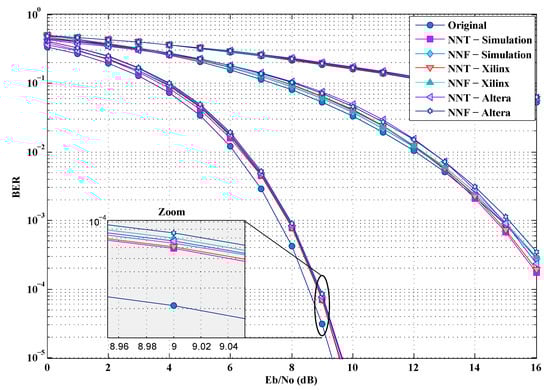 For comparing the achieved performance with that obtained by simulation, we choose a JTAG (joint test action group) hardware co-simulation []. This feature allows for simulating the whole or part of a design implemented directly on an FPGA platform. This approach also makes it possible to accelerate the simulation of a complex design and to verify its correct functioning in the hardware. The reason behind the use of a hardware co-simulation is to minimize the development time while avoiding implementing the entire OFDM transmission and reception system on an FPGA platform. In fact, only the proposed NN will be implemented on a hardware platform while the rest will be emulated by software. At each clock cycle, the software sends a data frame to the hardware for processing. The communication between the software and the hardware is carried out either by a JTAG or Ethernet cable for more speed (Figure 11).