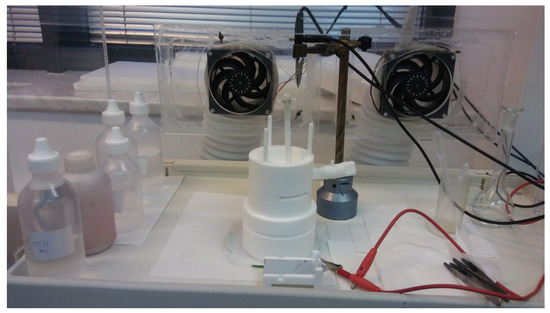 To assess the vapour concentration, we constructed a custom, hermetically sealed chamber of known volume. It consists of a Pyrex glass bell sealed to a steel bottom by a rubber gasket treated with Dow–Corning High Vacuum Grease. To be able to measure the electrical resistance, we made two electrically insulated and sealed contact ports in the bottom of the chamber. Also, a T–shaped fitting is screwed to the bottom, and connected to a PTFE septum and a vacuum pump. For a more efficient mixing of gases within the chamber, we placed a small electric fan powered by a brushless motor inside. The total volume of the chamber with the surrounding fittings is 4 dm3. The chamber is shown in Figure 3.