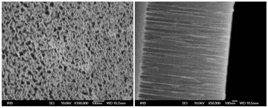 (Left) Scanning electron microscope (SEM) image of a sample after etching. (Right) Cross-sectional view of a sample showing the ∼1.6 μm thick porous layer on bulk silicon wafer. For details see Section 2.2.