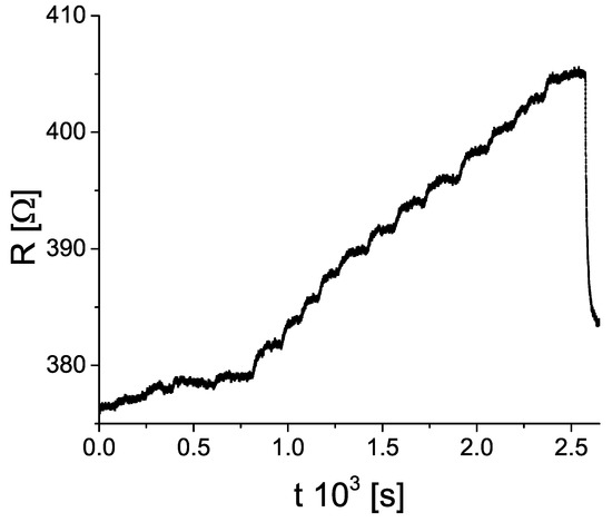 Dependence of electrical resistance of an oxidized sample on ammonia gas concentration (in ppm). Error bars showing five standard deviations are smaller than the size of the points. For details see Section 4.