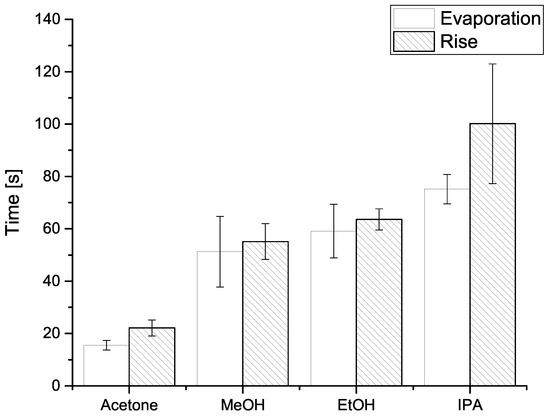 Histogram of mean evaporation time (blank) and resistance rise time (hatched) for (from left to right) acetone, methanol (MeOH), ethanol (EtOH), and isopropanol (IPA). On top of each column a range of one standard deviation is shown. Details are given in Section 4.