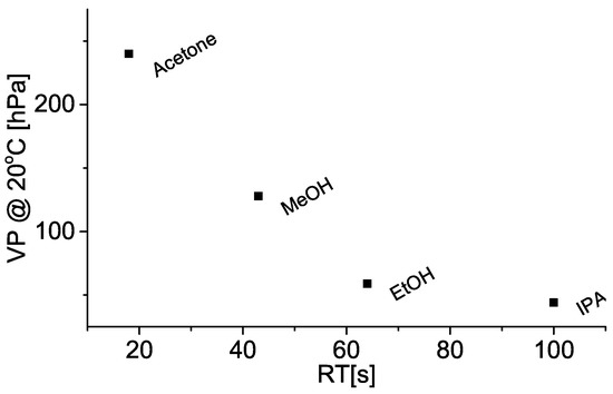 Dependence of solvent vapour pressure (VP) at 20 °C with respect to resistance rise time (RT) or (from left to right) acetone, methanol (MeOH), ethanol (EtOH), and isopropanol (IPA). Details are given in Section 4.