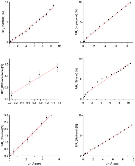 Then, we define the sensitivity as the slope of the fitted line. This value is a measure of relative change in resistance (), where R is the resistance upon exposing the sample to organic vapour, and is the baseline resistance of the sample in ambient air) with respect to concentration in ppm. We express this sensitivity in percent per ppm. It ranges from 6 × 10−4%/ppm for toluene, up to 8 × 10−4%/ppm for acetone. Here we remind the reader that all of the measurements were conducted for n–pentane as well, however with high level of noise. If we were to calculate the sensitivity for n–pentane, it would be −3 × 10−3%/ppm.