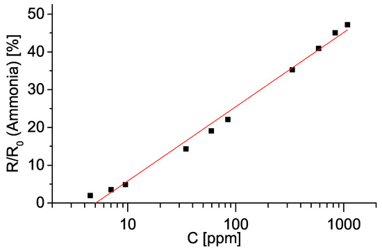 First we analysed the relative change in resistance in dependence on vapour concentration. This is shown in Figure 7. Resistance values have been time–averaged over a plateau of each step, while vapour/gas concentrations were calculated as described earlier in this section. We tested a linear model of resistance as a function of concentration. values for such a model range from 0.97 for ethanol and chlorobenzene up to 0.99 for methanol and acetone. Thus, we conclude that a linear model describes the above mentioned relationship relatively well. Change in resistance upon exposure to ammonia gas showed logarithmic behaviour, as shown in Figure 8.