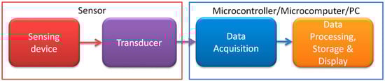 In recent years, there has been an unprecedented R&D increase in both new sensor designs [,,,,] and simplified microcontroller systems, such as Arduino []. However, there is a gap between new, experimental sensor output signals and standardized microcontroller inputs. It is most evident for inductive sensors, where much additional design work would be needed to procure outputs such as an 0–5 V DC output signal. Examples of such inductive sensors include magnetoelastic tensile, compressive and torsional [,,,,,,] devices, as well as various GMI (Giant Magneto Impedance) [,,,] and Stressimpedance sensors [,,]. Thus, there is still a place for the development of intermediate systems, i.e., sensor transducers (Figure 1).